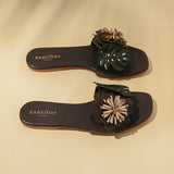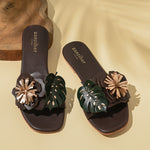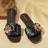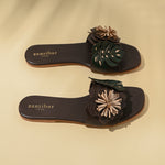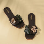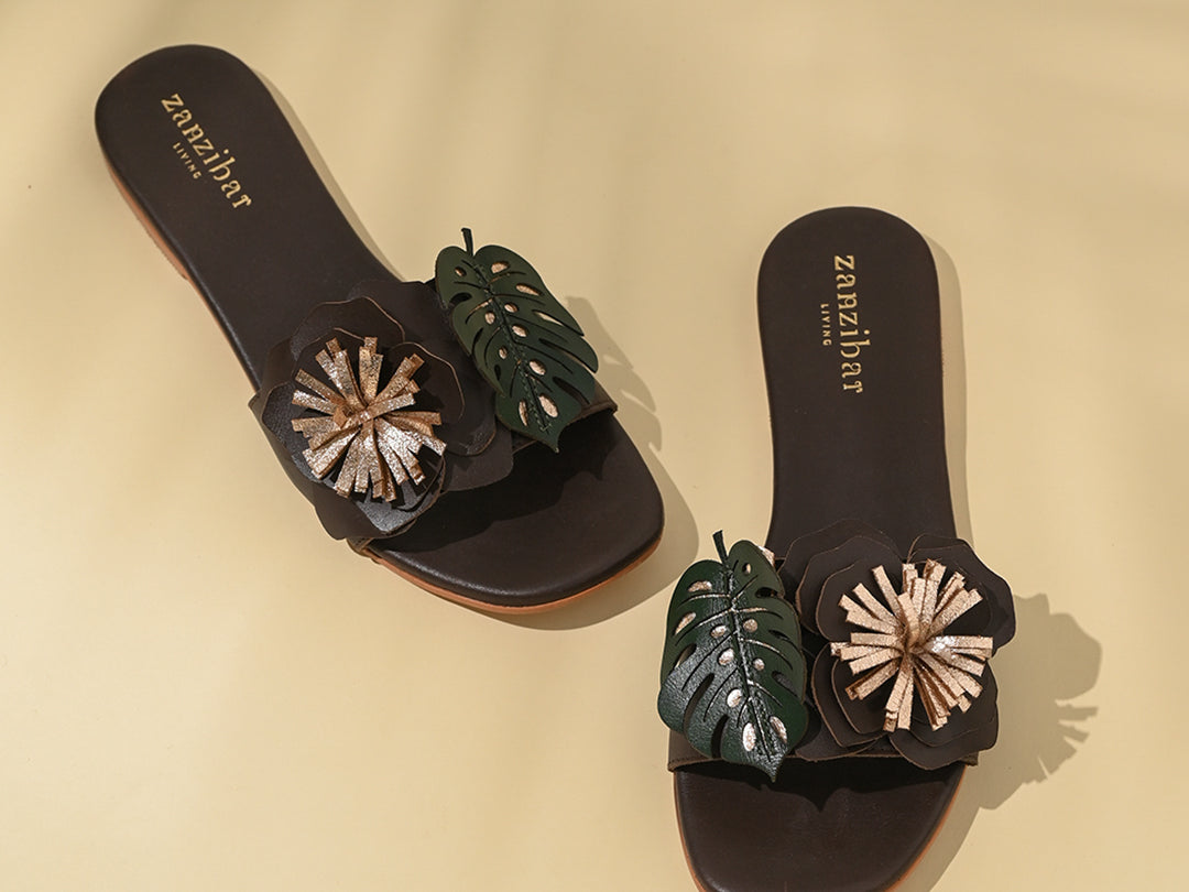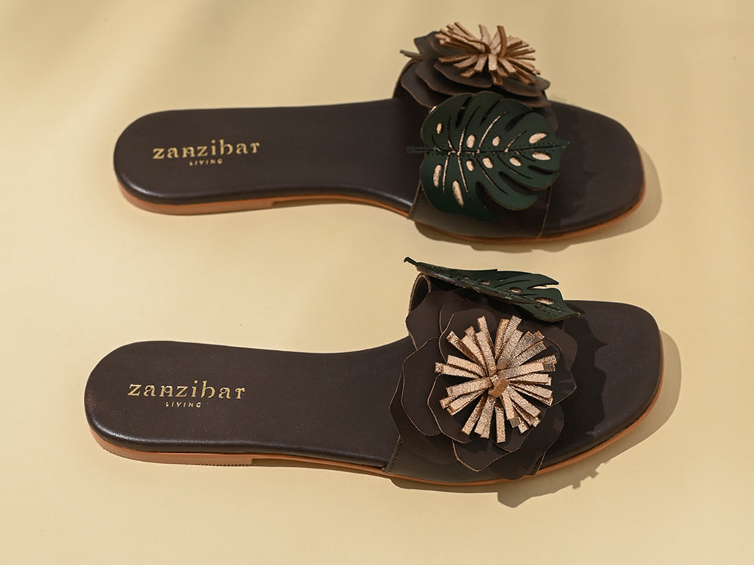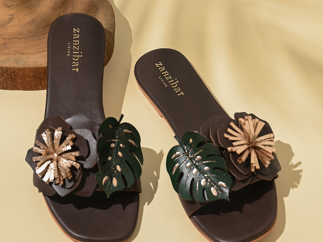 Handcrafted slides with hand cut flower and leaf detail wit gold lining. Best worn to amp up any look, sipping sangria and taking in the sunlight.