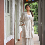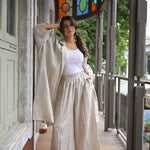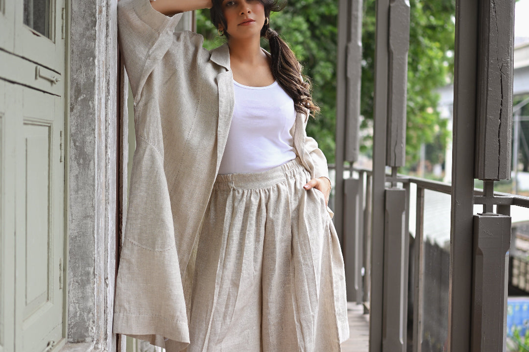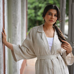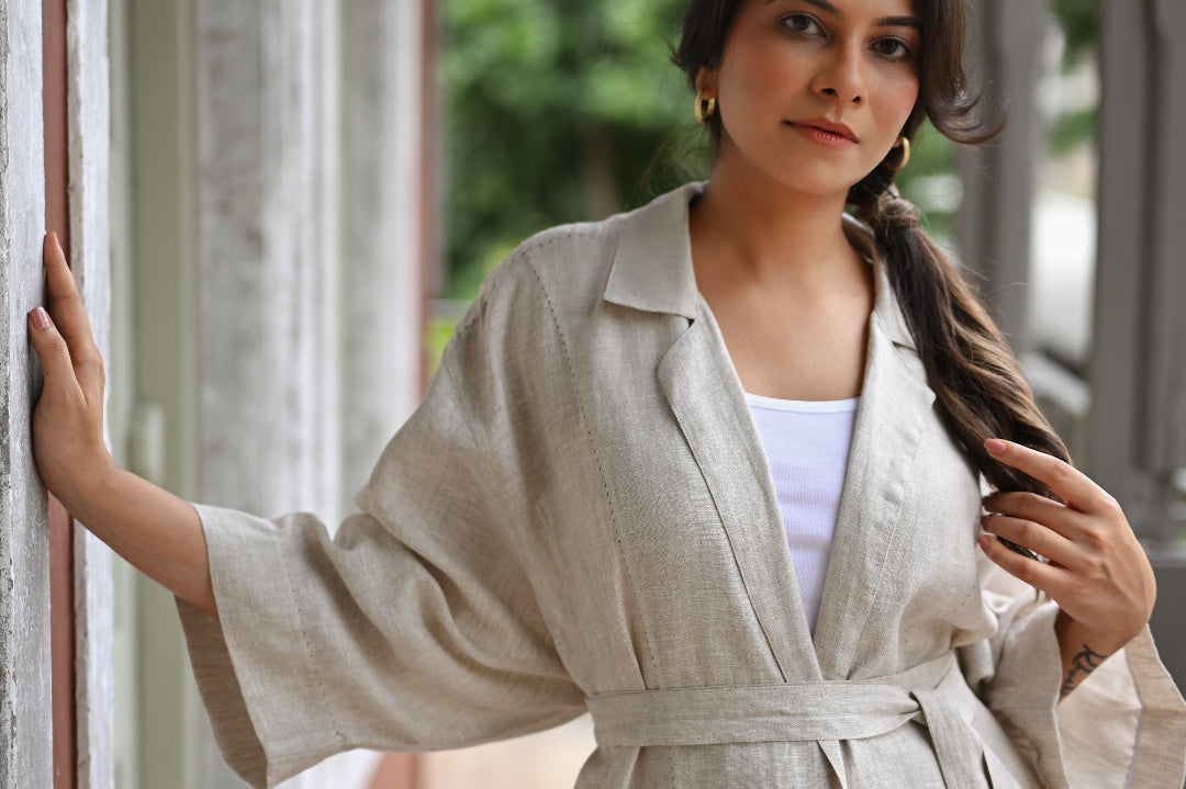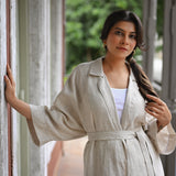 A long Jacket Trench in Organic Linen which can be worn as an open cape or belted for more structure. It can be paired with our cascadian linen pants or with almost anything from your