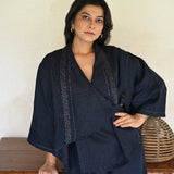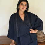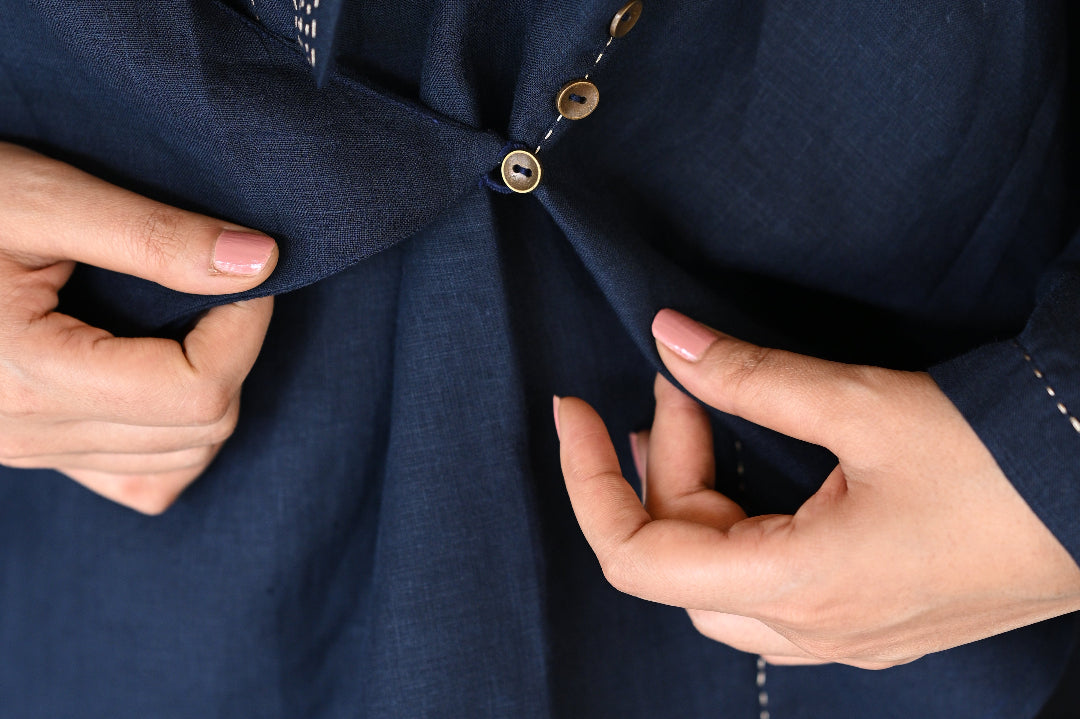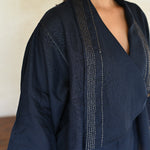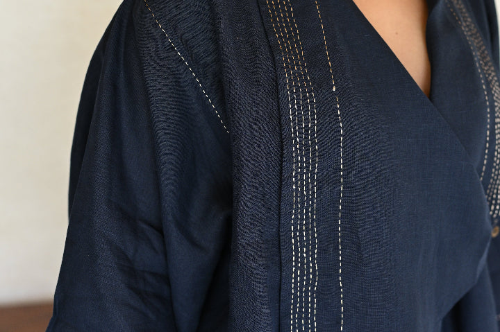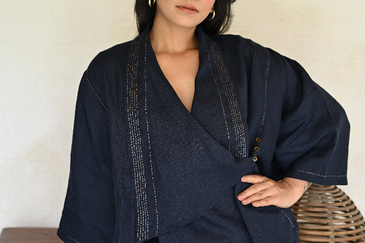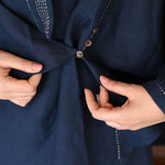 Organic linen overlay with a hand embroidered kantha stitch panel in gold thread is a timeless classic & a wardrobe must have. The Haori kantha jacket has a beautiful overlays structure with tie ups and buttons along the side.