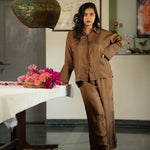 A silk co-ord set made for those who love timeless ease. The free size relaxed-fit top features badla details along the collar, sleeves, and pockets, small glimmers that catch the light subtly. The matching straight-leg trousers bring balance, creating a set that’s as effortless as it is refined.